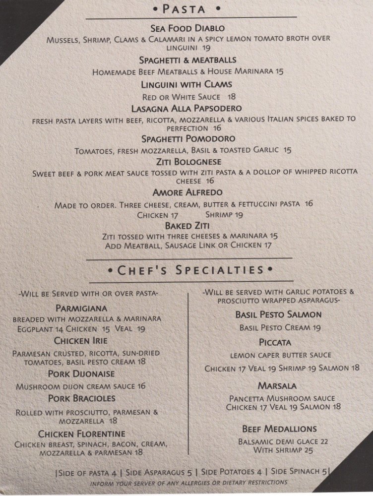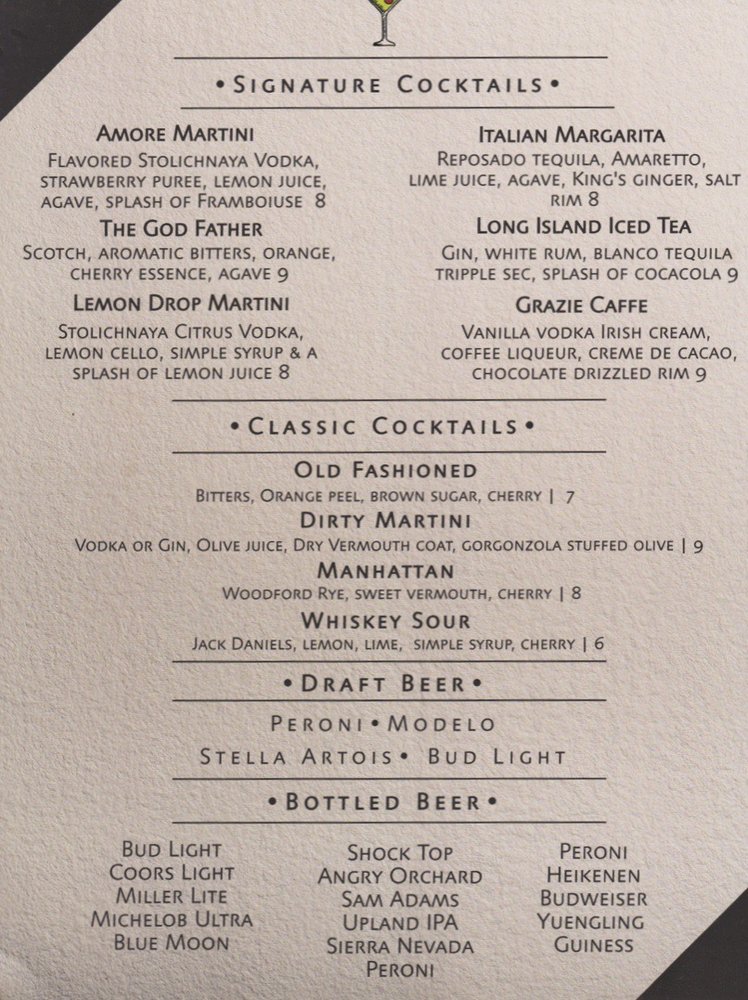 Highlights include the flavor-packed Mozzarella Sticks and the savory Spaghetti with Italian Sausage and Meatballs, frequently praised by satisfied diners. Indulge in the Chilean Sea Bass paired perfectly with creamy polenta, a dish that many declare life-changing. The cozy, family-friendly atmosphere, combined with outstanding service, creates an inviting dining experience.