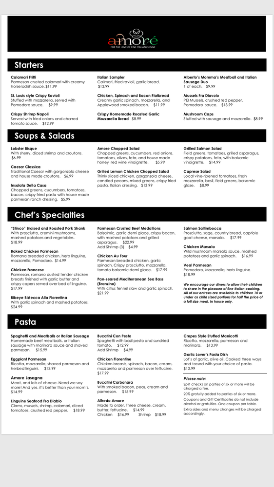 Welcome to Amore Fine Italian Ristorante, a hidden gem nestled in Floyds Knobs, IN. This charming Italian eatery offers a delightful escape with a menu that celebrates the essence of authentic Italian cuisine. With options that cater to various tastes, including a generous selection of vegetarian dishes, Amore ensures there's something for everyone.